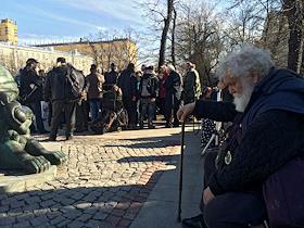 Более 50 художников, выгнанных с Арбата, задерживаемых там полицией с января 2016, собрались на сход на Гоголевском бульваре.