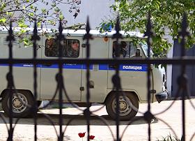 Жанровая фотография. Автомобиль полиции для перевозки задержанных во дворе Тарасовского районного…