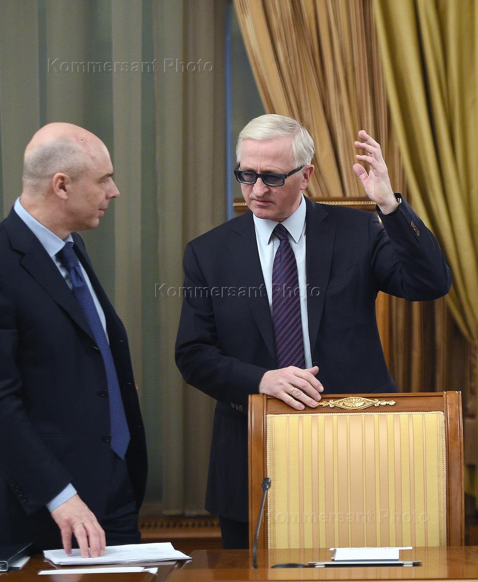 Заседание правительства России. Министр финансов России Антон Силуанов (слева) и президент…