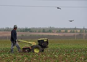 Жанровая фотография. Мужчина с мотоблоком во время окучивания растений на поле.