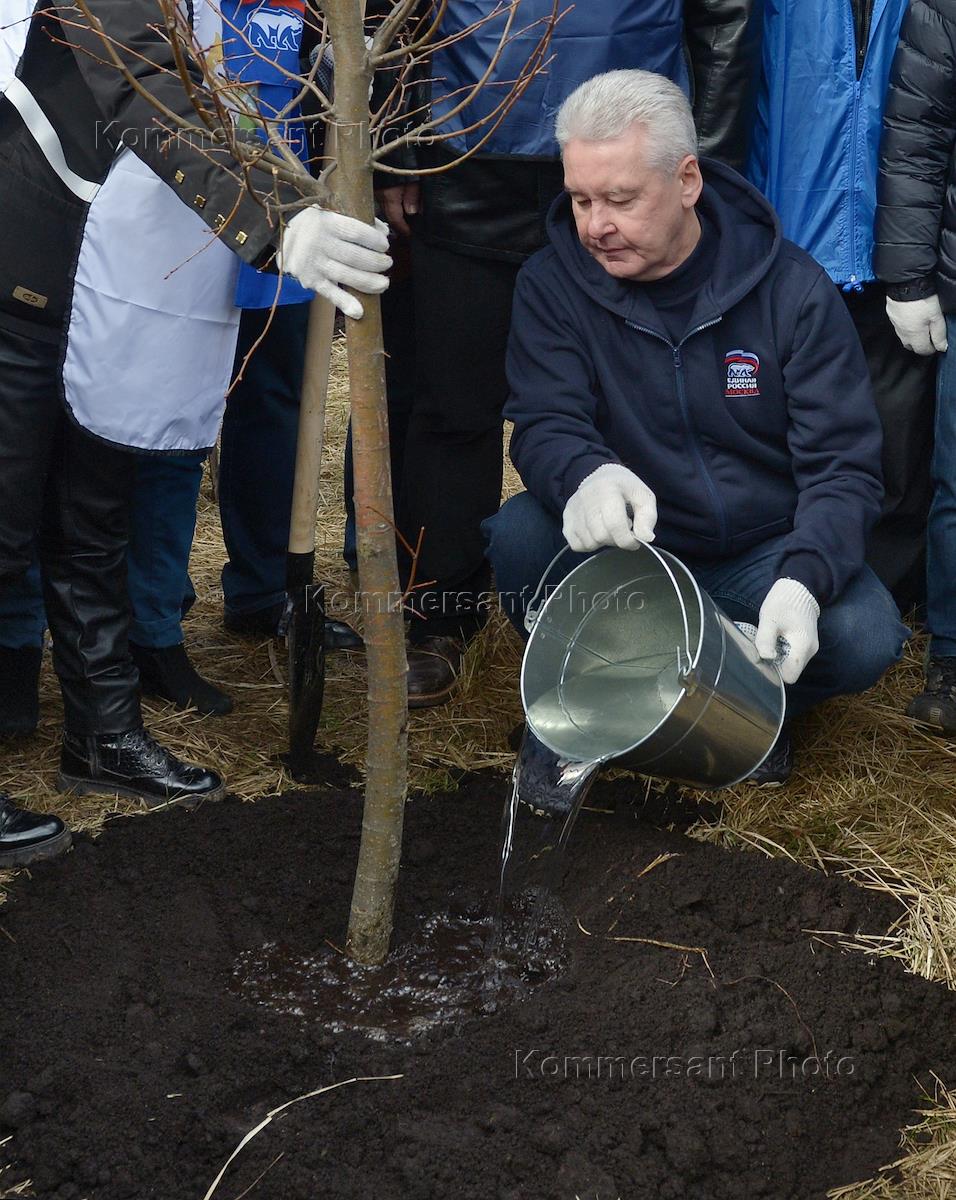 Мэр Москвы Сергей Собянин во время посадки деревьев на субботнике по благоустройску города в Тушино.