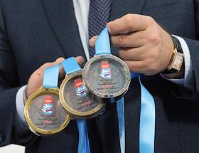 Медали, представленные на пресс-конференции, посвященной чемпионату мира по хоккею с шайбой – 2016.…