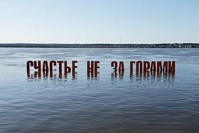 Виды Перми. Причал у речного вокзала. Река Кама. Арт-объект "Счастье не за горами" во время паводка.