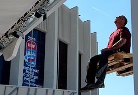 Дворец спорта "Юбилейный" во время подготовки к чемпионаты мира по хоккею. Рабочие монтируют…
