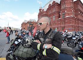 Президент Российской ассоциации байкеров Александр Залдостанов с байкерами клуба "Ночные волки" во…