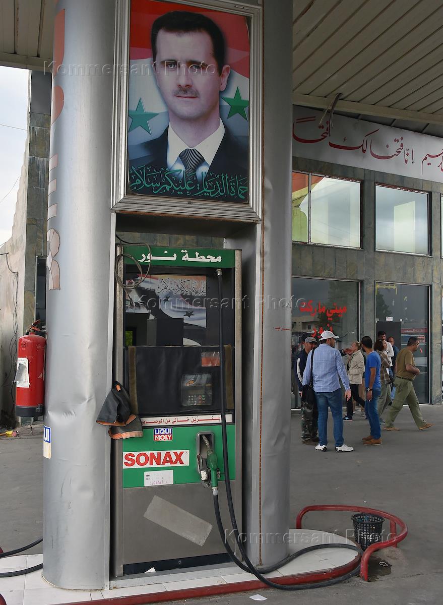 Жанровая фотография. Ситуация в Пальмире. Портрет президента Сириии Башара Асада на автозаправочной…