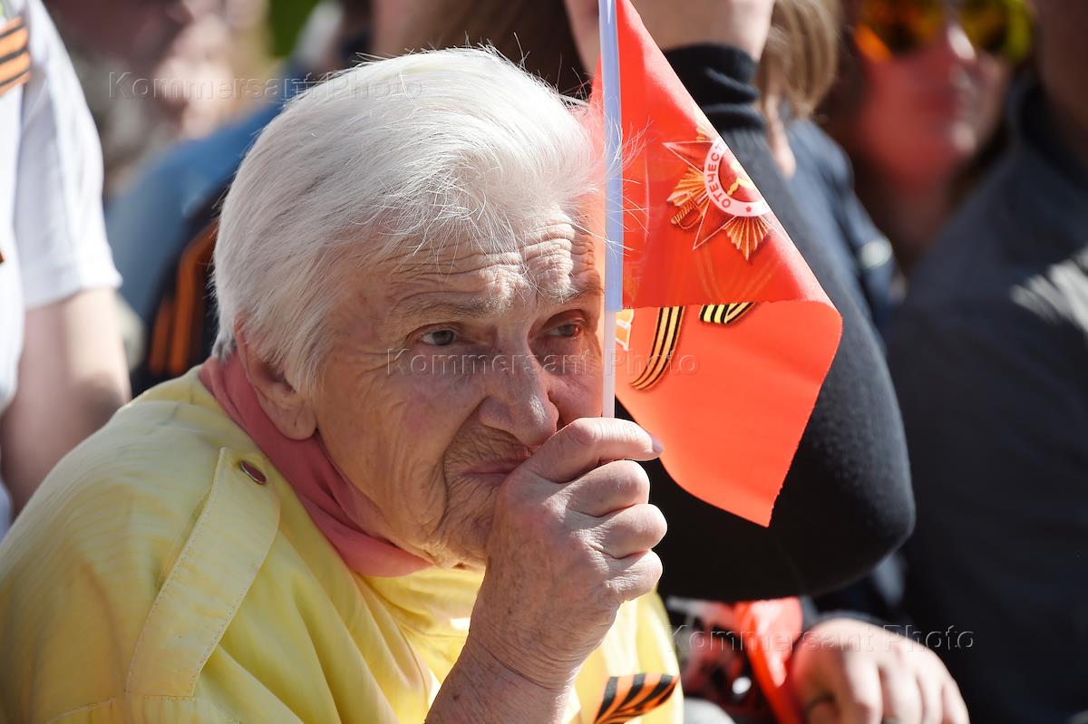 Акция памяти "Бессмертный полк" в День Победы. Пожилая женщина c флажком.