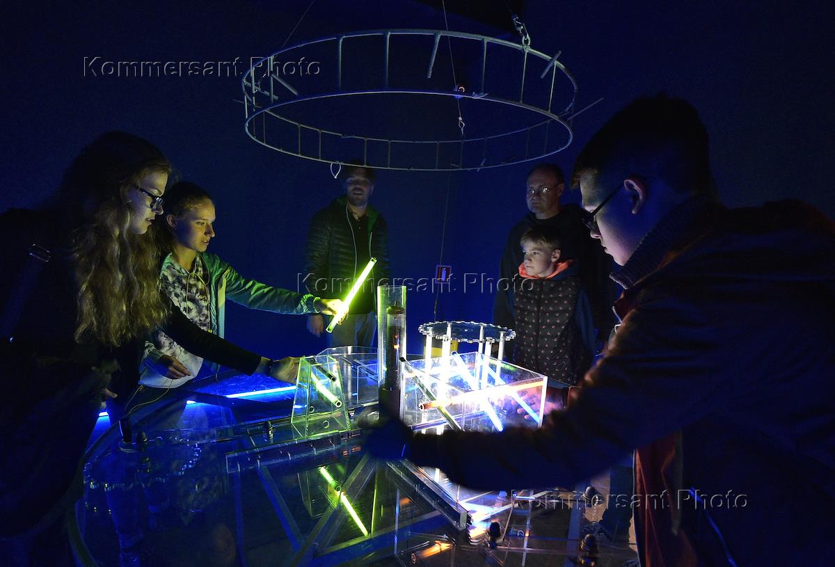 Акция "Ночь в музее". Посетители у экспонатов, демонстрирующих достижения технического прогресса, в…