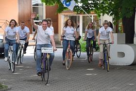 Участники московского велопарада от радиостанции "Коммерсантъ FM" во дворе редакции.