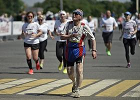 Благотворительный легкоатлетический забег Adidas "Бегущие сердца" на Воробьевых горах. Пожилой…