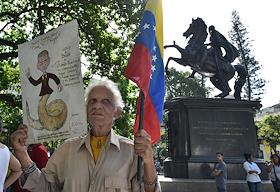 Жанровая фотография. Виды Каракаса. Мужчина с плакатом и флагом во время протеста у памятника.