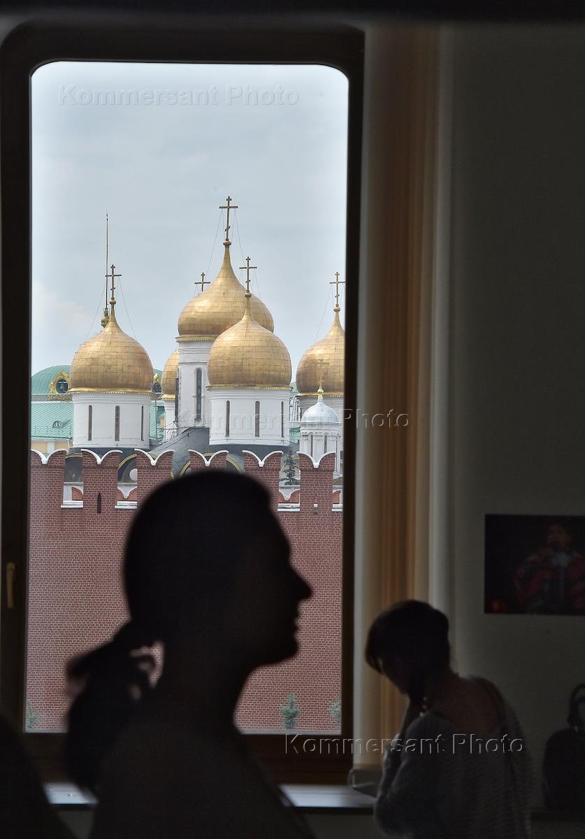 Жанровая фотография. Купола Успенского собора в Кремле за кремлевской стеной.
