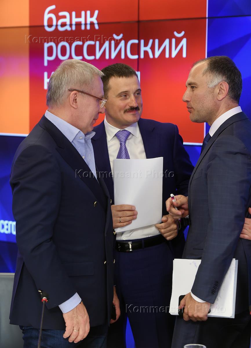 Председатель правления АКБ "Российский капитал" Михаил Кузовлев (справа) во время пресс-конференции,…