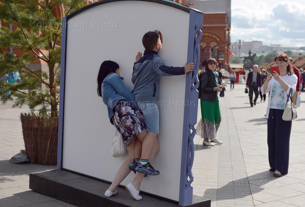 Жанровая фотография. Подростки фотографируются рядом с Манежной площадью.