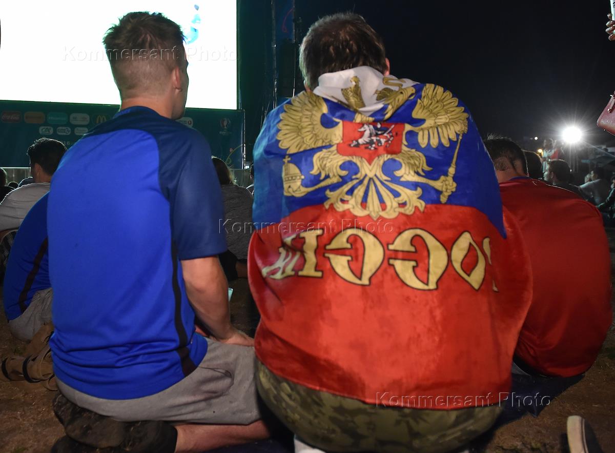 Чемпионат Европы по футболу "EURO 2016". Жанровая фотография. Российские болельщики в спортивном…