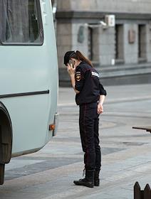 Жанровая фотография. Виды Москвы. Сотрудница полиции разговаривает по мобильному телефону на улице…