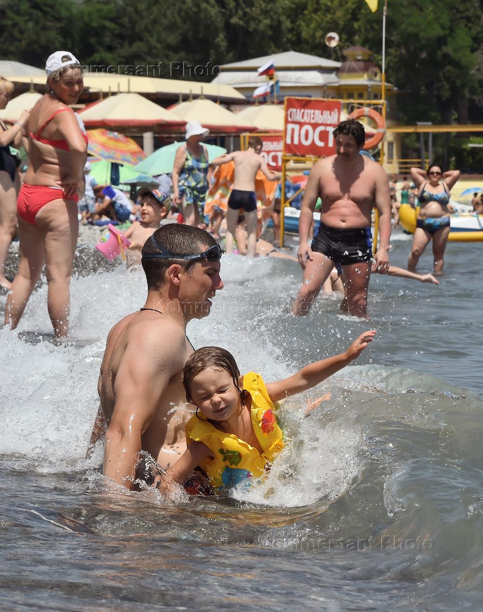 Жанровая фотография. Отдыхающие на пляже. Дети купаются в море.
