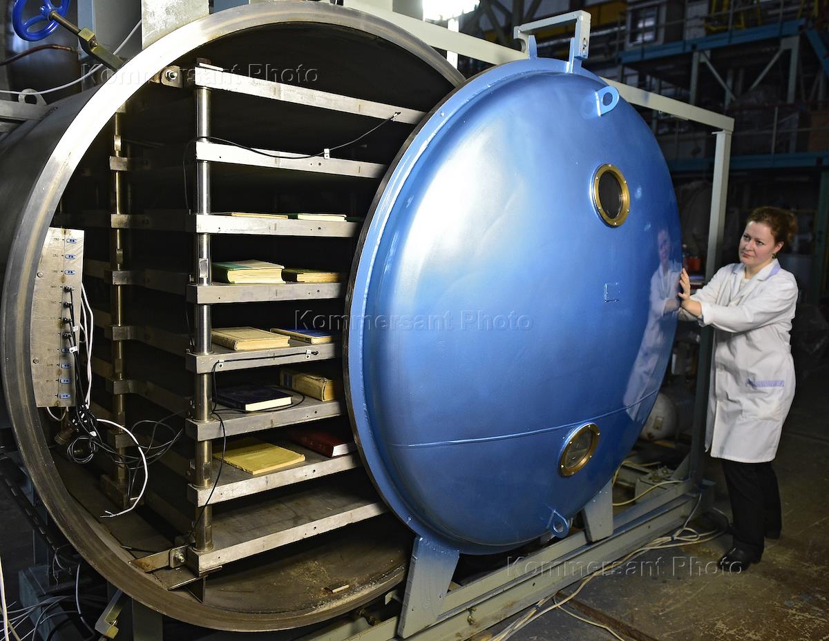 Спасенная от пожара библиотека Института научной информации по общественным наукам РАН в цехах Научно-производственного объединения "Молния".