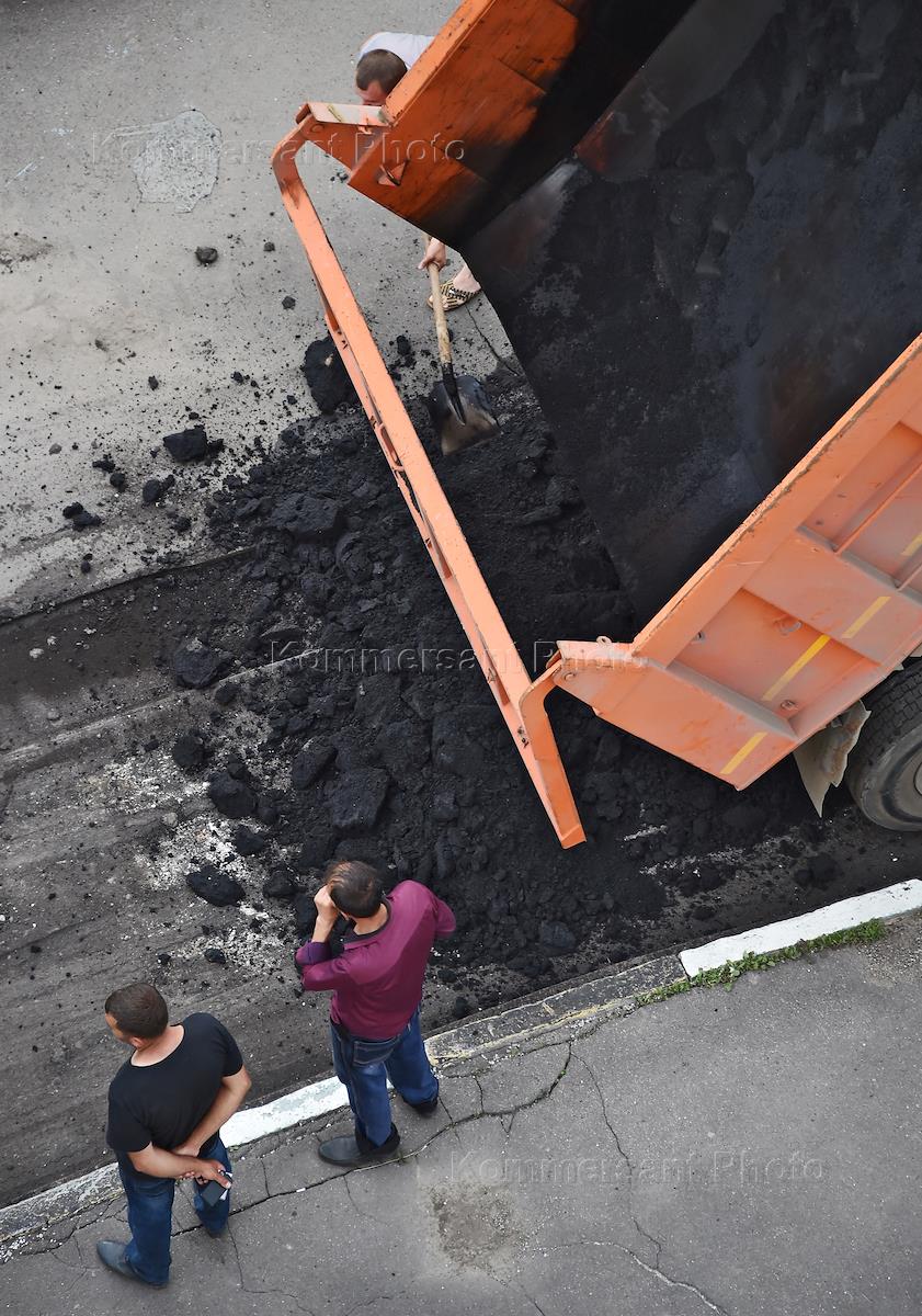 Жанровая фотография. Виды Красноярска. Рабочие во время укладки асфальта на дороге.