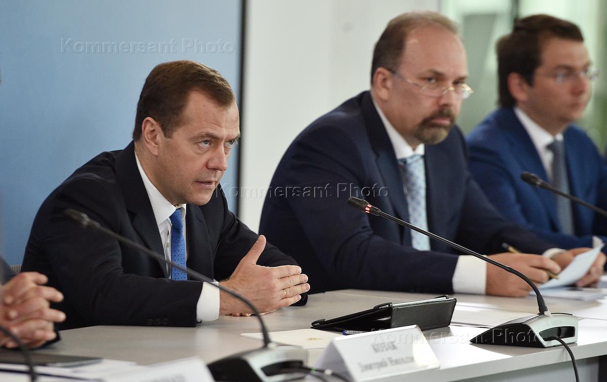 Cлева направо: председатель правительства России Дмитрий Медведев, министр строительства и…