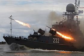 Показательные стрельбы во время парада, посвященного празднованию Дня Военно-морского флота России.