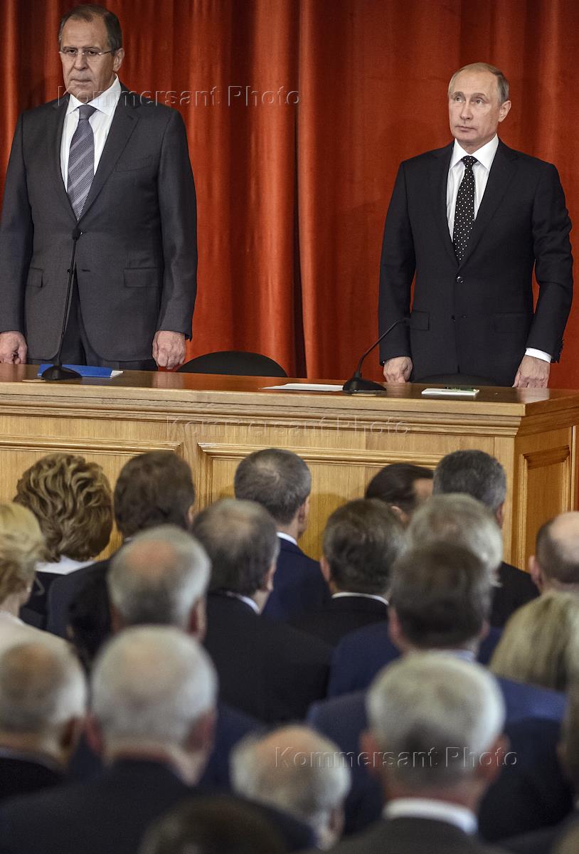 Президент России Владимир Путин (справа) и министр иностранных дел Росии Сергей Лавров (слева) на…