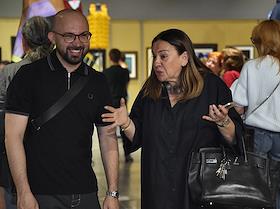 Художник Лев Евзович (слева) и дизайнер Юрий Аввакумов (справа) на церемонии открытия выставки…