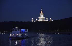 Виды вечерней Москвы. Москва-река. Здание Московского государственного университета (МГУ) имени…