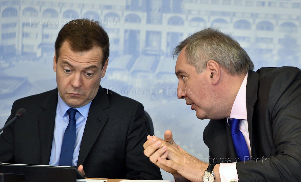 Председатель правительства России Дмитрий Медведев (слева) и его заместитель Дмитрий Рогозин…