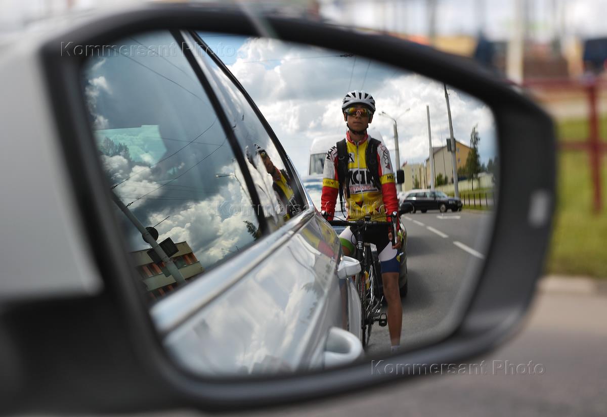 Жанровая фотография. Дорожное движение в Витебске. Отражение велосипедиста в зеркале бокового вида…