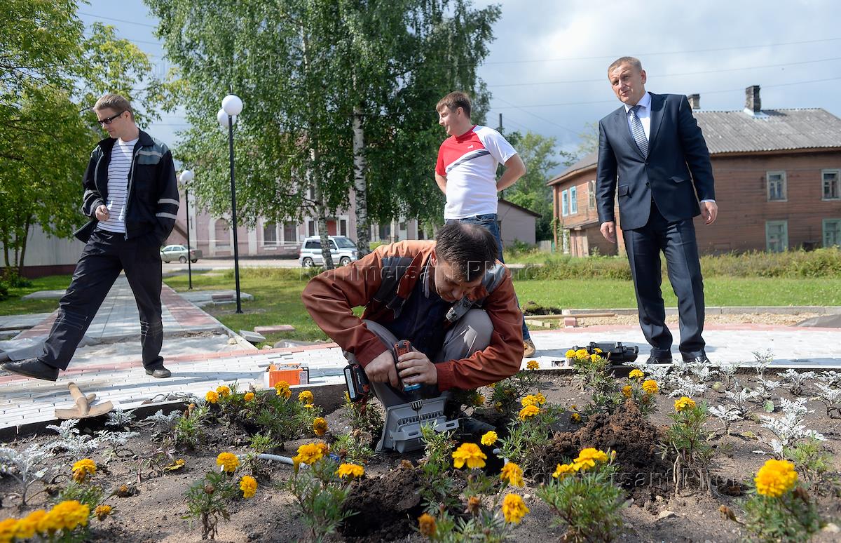 Глава Окуловского муниципального района Сергей Кузьмин (справа) во время подготовки города к…