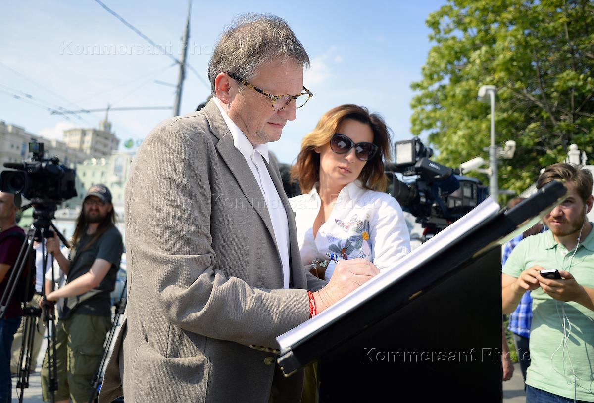Модельер Валентин Юдашкин с супругой Мариной во время возложения цветов у посольства Франции в…