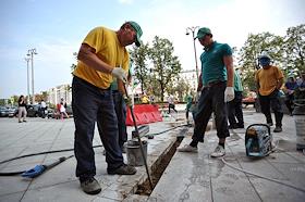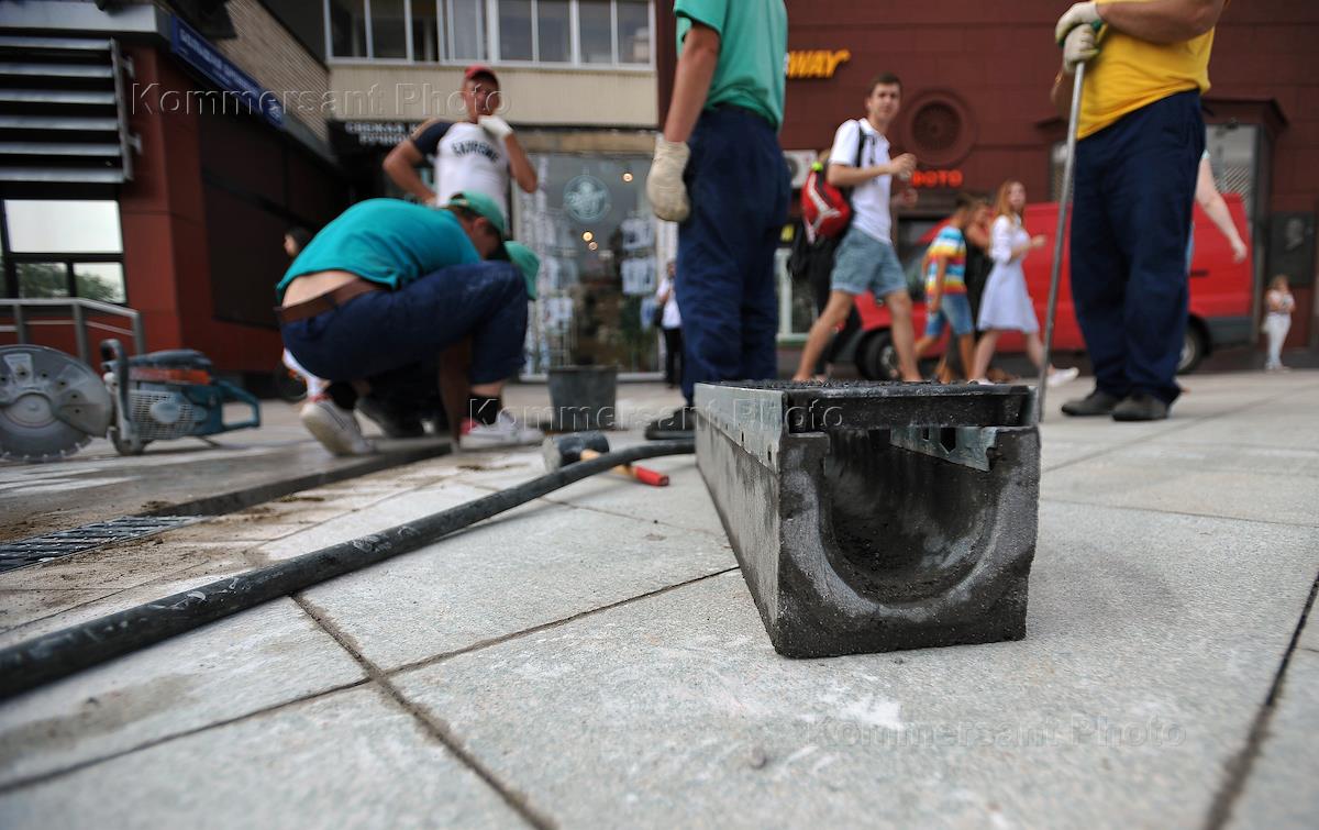 Жанровая фотография. Установка дождевой (ливневой) канализация (ливневка) на Пушкинской площади.