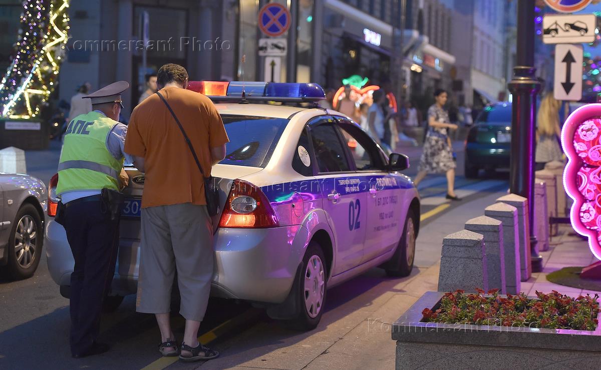 Жанровая фотография. Сотрудник ДПС у служебного автомобиля во время проверки документов у водителя…