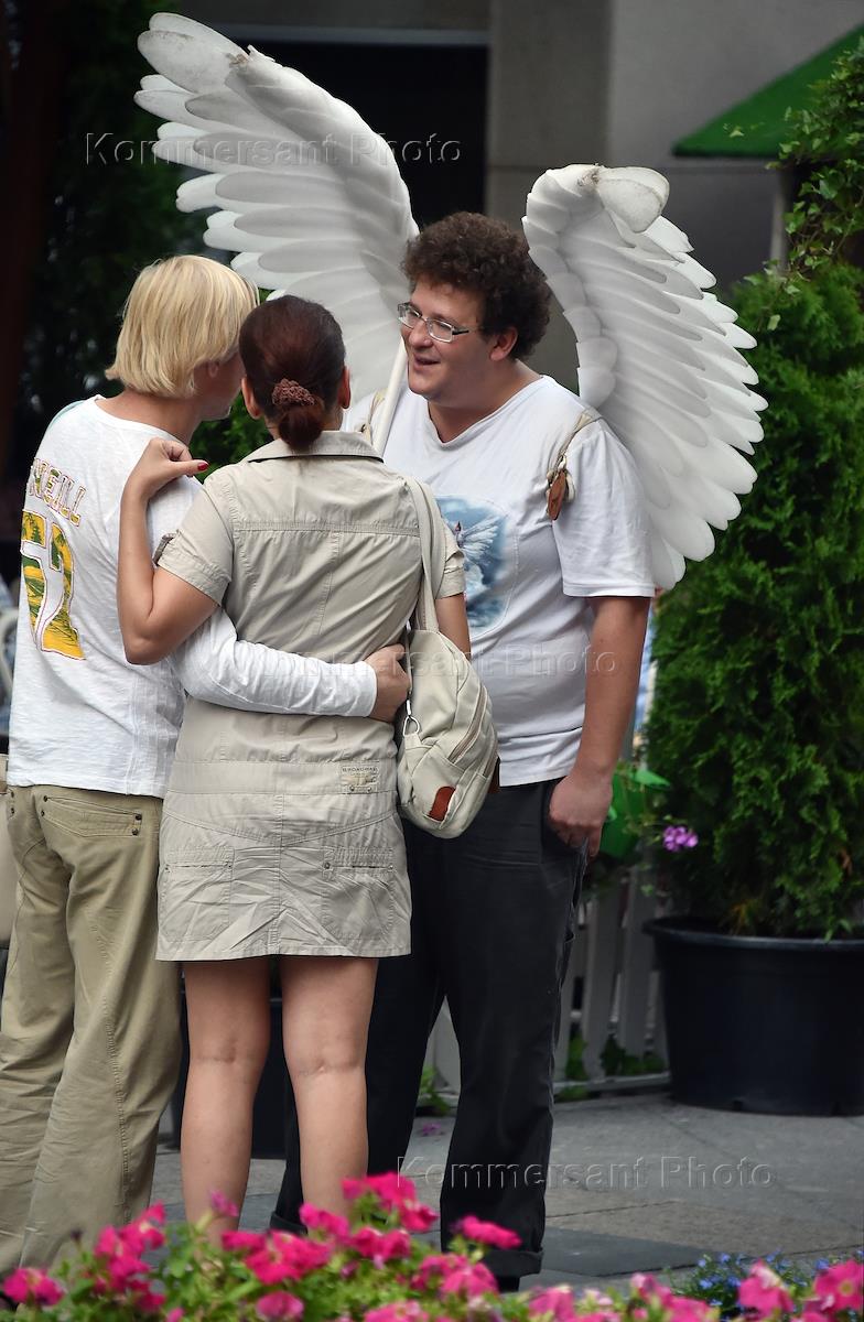 Жанровая фотография. Мужчина с крыльями ангела на улице Москвы.
