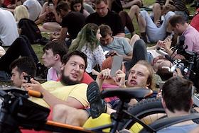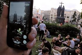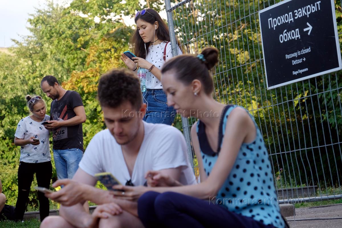 Жанровая фотография. Игроки в компьютерную игру на мобильном телефоне (смартфоне) Pokemon GO…