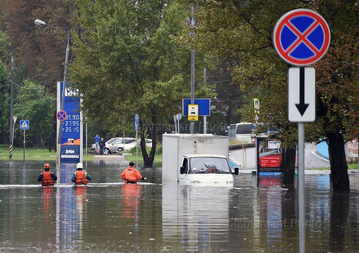 Жанровая фотография. Последствия проливных дождей в городе. Затопленная автомобильная дорога на…