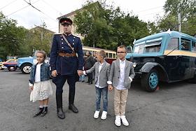 Юные посетители на параде ретротехники, посвященном 92-й годовщине московского городского автобуса…