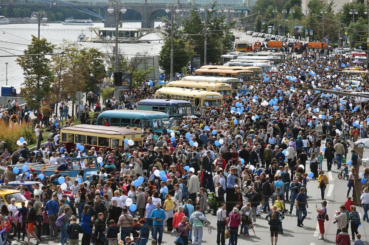 Посетители на параде ретротехники, посвященном 92-й годовщине московского городского автобуса на…