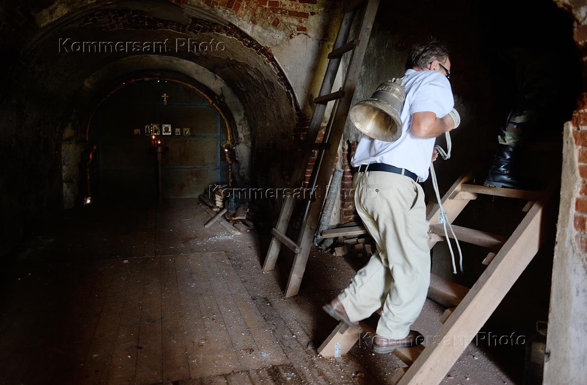 Установка колоколов на затопленную колокольню Никольского собора бывшего Николо-Жабенского монастыря.
