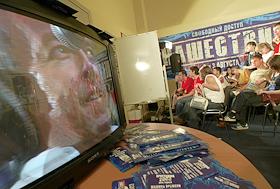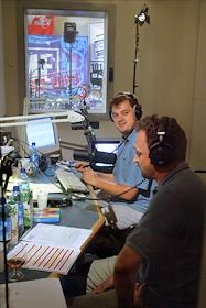 Спортивные комментаторы Уткин Василий (слева) и Виктор Гусев (справа) во время рок-фестиваля…