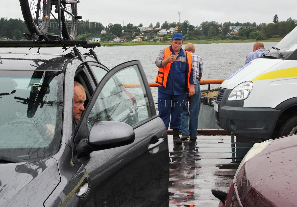Переправа автомобилей через реку Волгу на пароме. Кассир взымает плату с водителей автомобилей за…