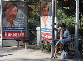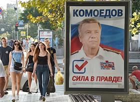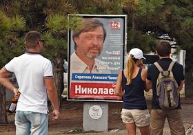 Политика Предвыборные плакаты в Севастополе с кандидатами в депутаты Государственной Думы Комоедовым, Дмитрием Беликом (Единая Россия) и Олегом Николаевым.