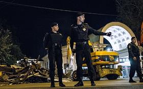 Жанровая фотография. Сотрудник полиции на месте сноса зданий, построенных без разрешения на площади…