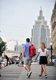Жанровая фотография. Виды Москвы. Молодые люди прогуливаются по улице.
