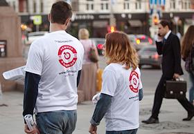 Жанровая фотография. Предвыборная агитация в Москве. Эмблема партии "Яблоко" на футболках волонтеров.