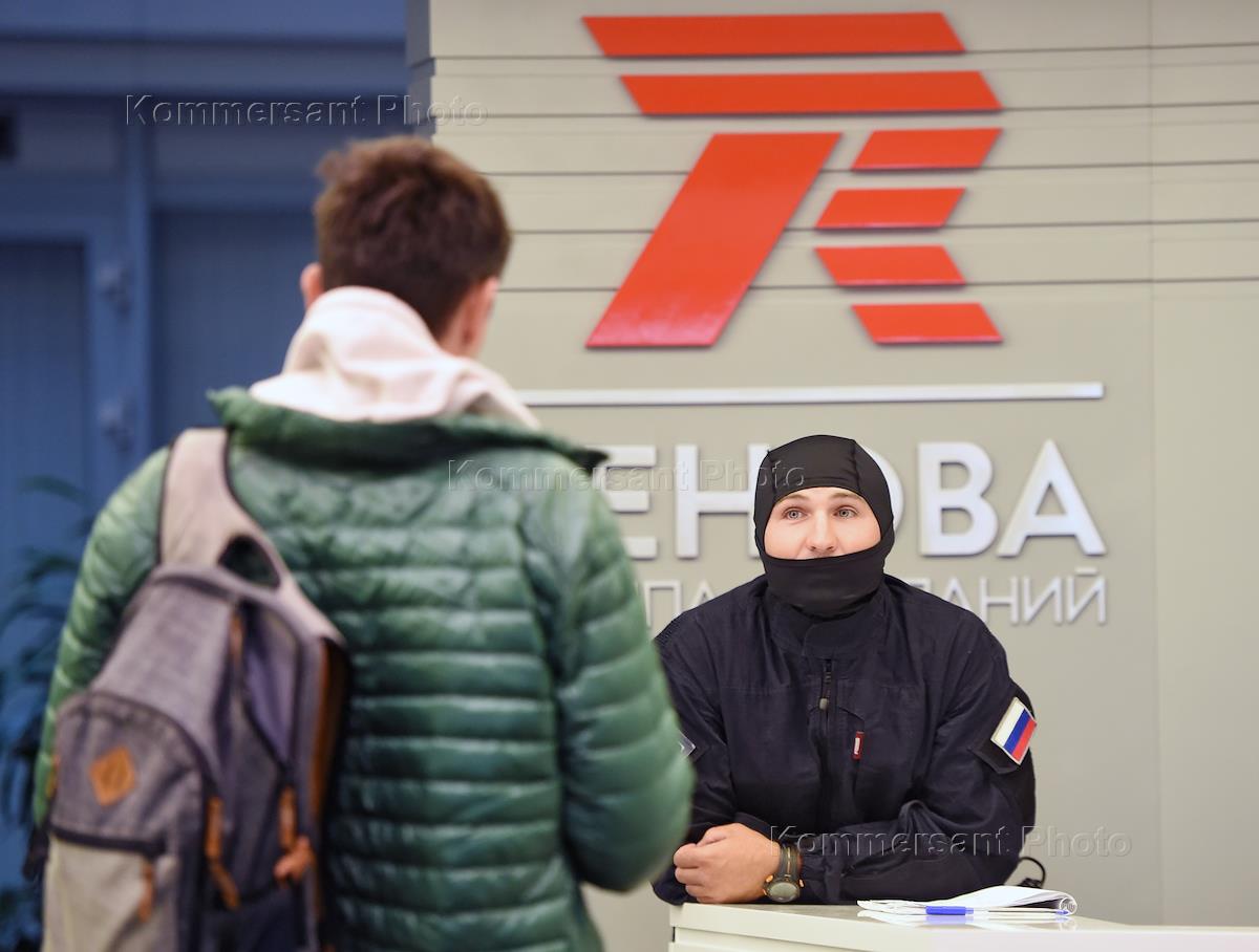 Обыски в штаб-квартире группы компаний "Ренова". Люди в камуфляже проходят сквозь турникет у стойки…