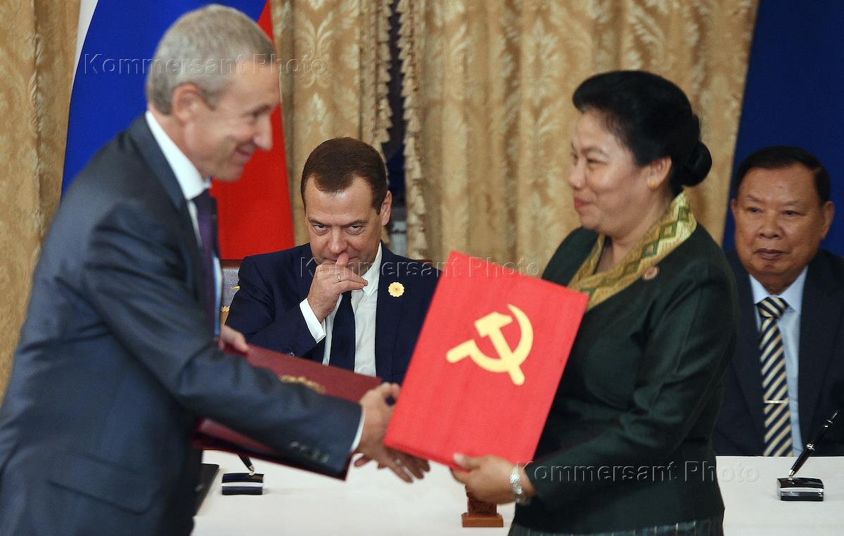 Рабочая поездка председателя правительства Дмитрия Медведева в Лаос. Слева направо: председатель…