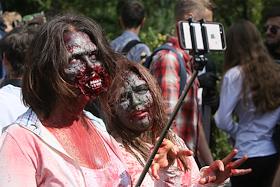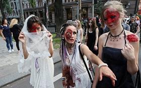 Шуточный парад "зомби",в котором участвовали загримированные молодые люди. Они прошли толпой по центральным улицам города и пугали прохожих.