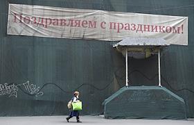 Жанровые фотографии. Транспарант "Поздравляем с праздником!" на здании закрытом строительной сеткой.